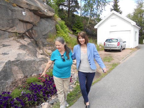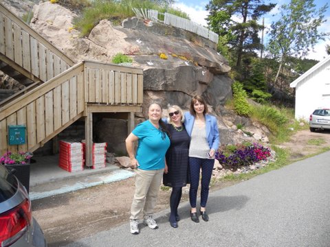 Kitty, Corinne, and Rønnaug in front of her home in Svelvik along the fjord; downstairs is guest apartment